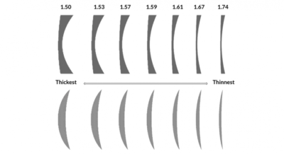 - Your budget: Higher lens index materials tend to be more expensive than lower ones. You will need to balance the cost and the benefit of thinner lenses.
